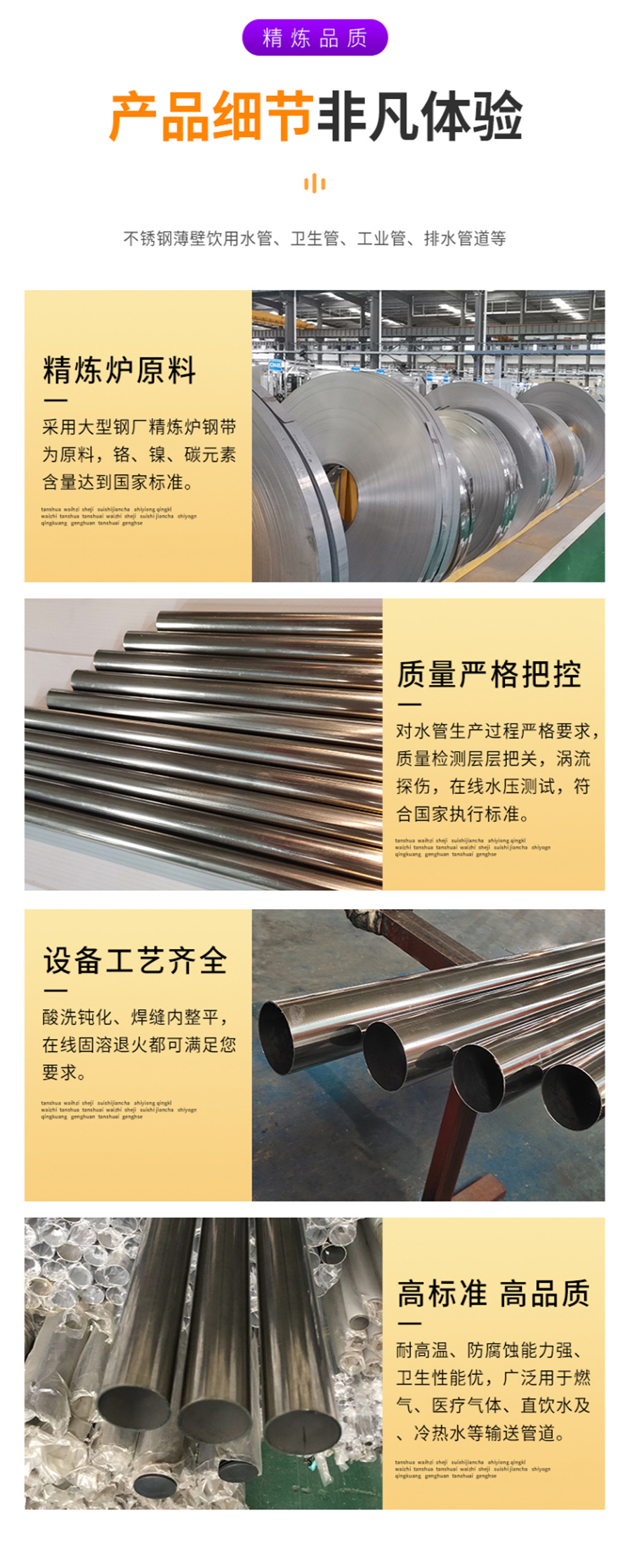 4.高標(biāo)準(zhǔn) 高品質(zhì):水樂薄壁不銹鋼水管品質(zhì)要求很高,耐高溫,耐腐蝕性能強(qiáng),衛(wèi)生性能優(yōu),廣泛用于燃?xì)?,醫(yī)療氣體,直飲水及冷熱水等輸送管道。