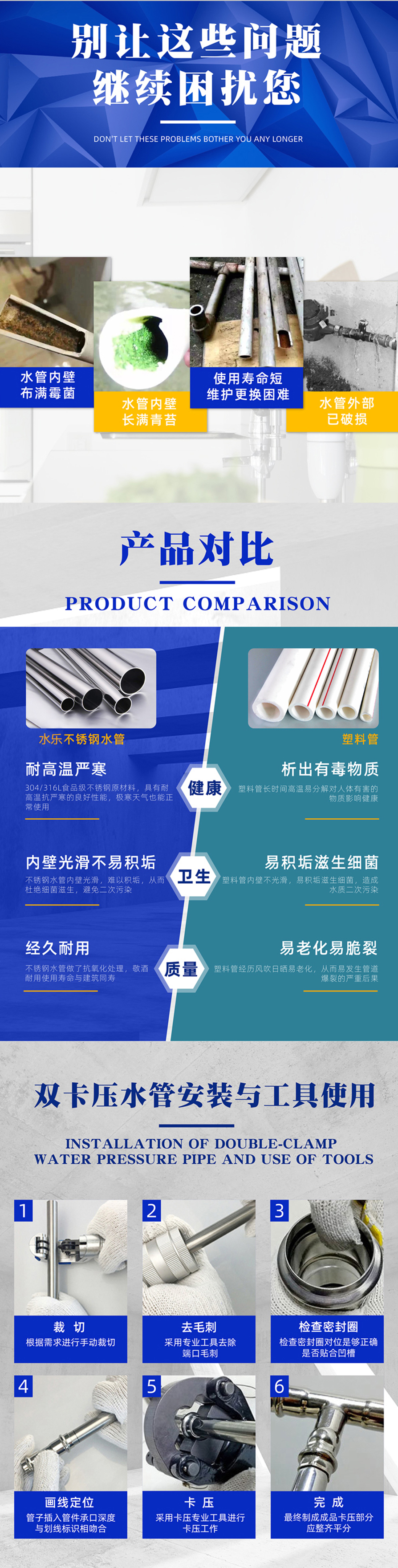 2.不銹鋼水管耐高溫,耐高壓,強(qiáng)度高,可承受98Mpa的瞬間壓力,是塑料水管的10倍,銅管的3倍。