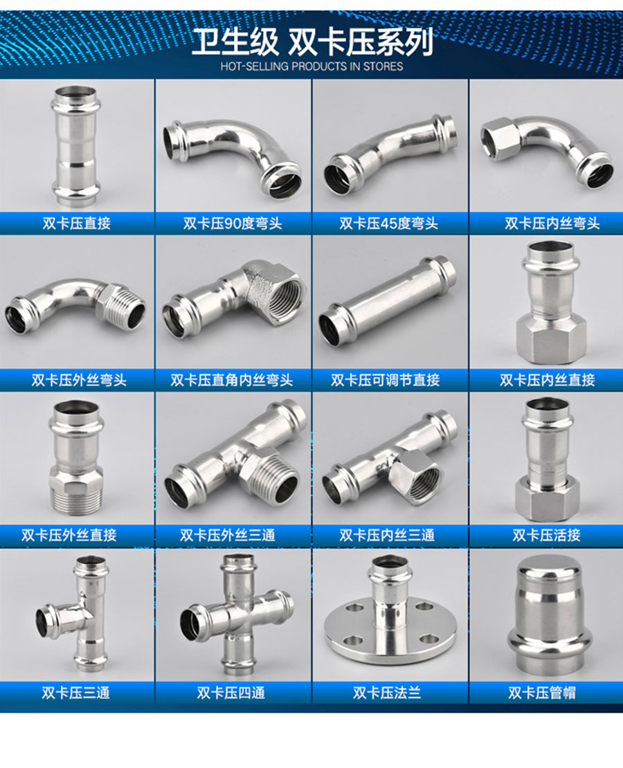 卡壓式管件中的雙卡壓管件是由單卡壓改進(jìn)而來(lái)、集中了單卡壓的優(yōu)點(diǎn),甚至連接穩(wěn)定系數(shù)和安全系數(shù)、密封指數(shù)大于單卡壓連接,從理論上講,雙重卡壓、雙重密封、穩(wěn)固性也有雙重保護(hù),對(duì)于長(zhǎng)期供水或者其他氣體、液體管道而言、安全性會(huì)高很多,管道的使用也會(huì)長(zhǎng)久些,據(jù)熟悉,在不銹鋼管道的安裝中,用雙卡壓連接不銹鋼管的接受率更大些。