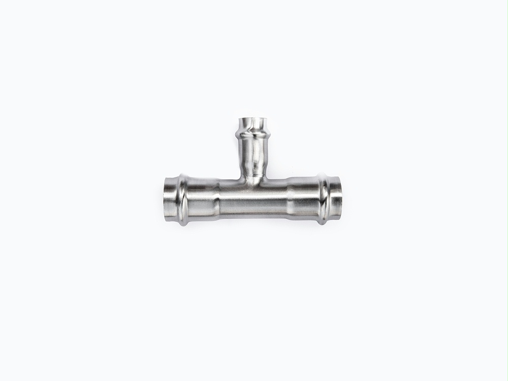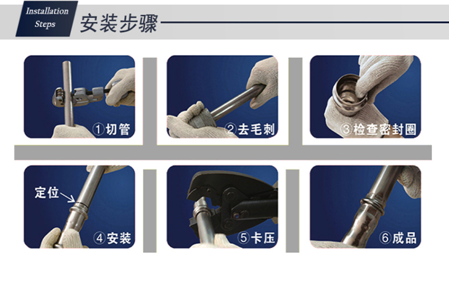 雙卡壓式薄壁不銹鋼管連接是將管材插入管件,利用不銹鋼材料的有效剛性和密封材料的彈性壓縮比原理,同時(shí)充分利用承接口的長度在管件承接口的U型槽兩側(cè)用專用卡壓工具進(jìn)行徑向壓接。